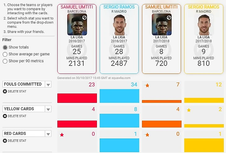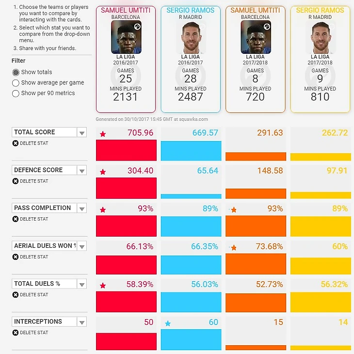 Давайте сравним его статистику с другим ЦЗ - Самюэлем Умтити
