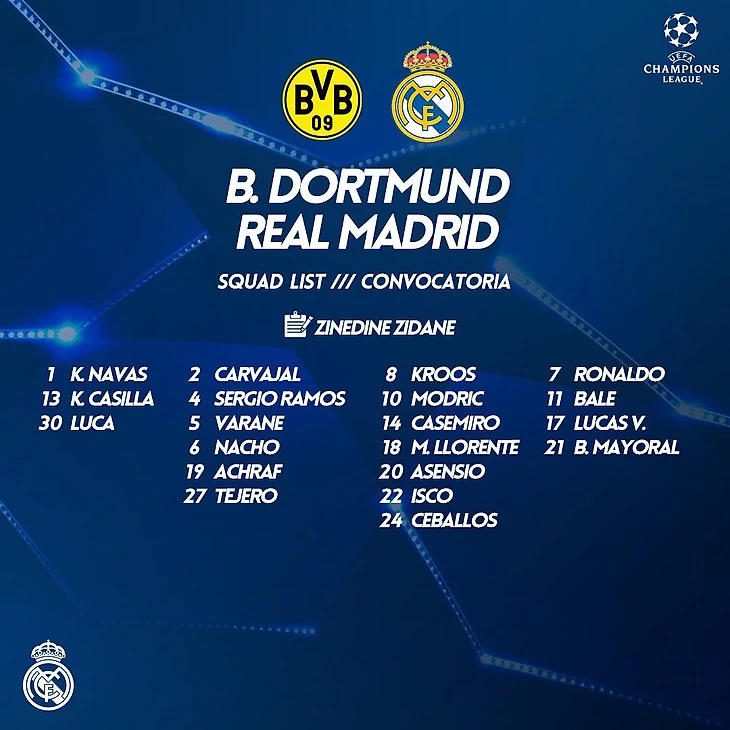 Не сыграют Карим Бензема, Марсело, Тео, Маттео Ковачич и Хесус Вальехо. Все они продолжают восстановление после полученных повреждений. Тони Кроос оправился после травмы и готов сыграть. Место на левом фланге защиты займет Начо, а дуэт нападающих составят Гарет Бэйл и Криштиану Роналду. Было бы интересно посмотреть на противостояние валлийца и Марка Бартры =)