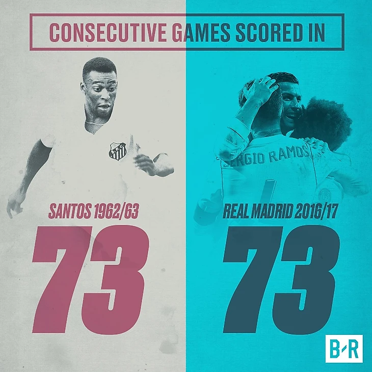 "Реал Мадрид" повторяет рекорд бразильского "Сантоса" забивая 73 матча подряд. Если "Реал Мадрид" забьет в следующем матче, то установит мировой рекорд. Вперед Мадрид!