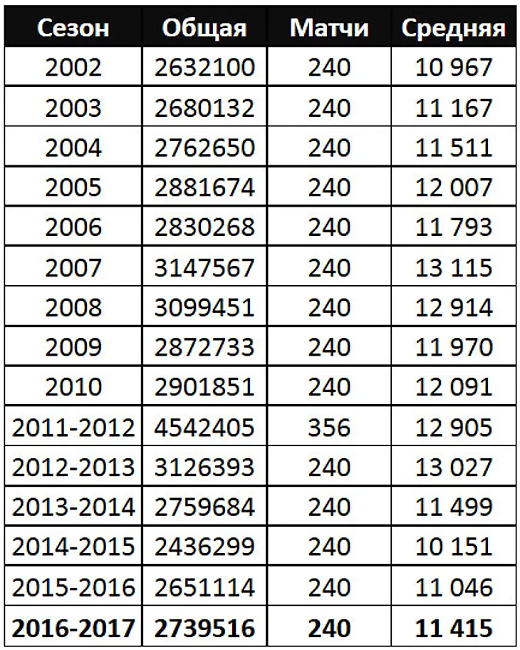 Автор Recoba78 Посещаемость РПЛ за 15 лет в динамике