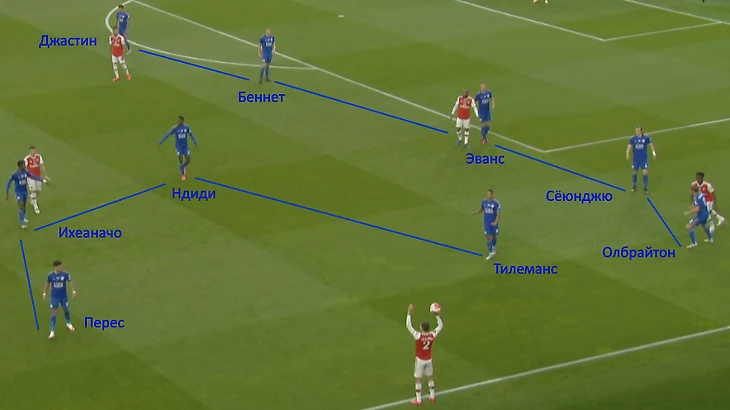 Олбрайтон и Джастин играют по всему флангу. Единственное изменение: не 3-4-3 в чистом виде, а 3-4-2-1, где Айосе Перес и Келечи Ихеаначо играют двух «десяток» и находятся ближе к полузащитникам.