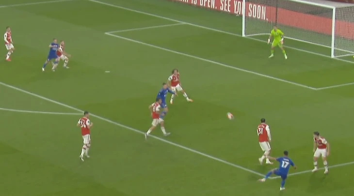 На 21-ой минуте после розыгрыша углового у ворот «Лестера» Тирни пробьёт по воротам, но мимо. На той же 21-ой минуте Сака отдаст голевой пас на Обамеянга.