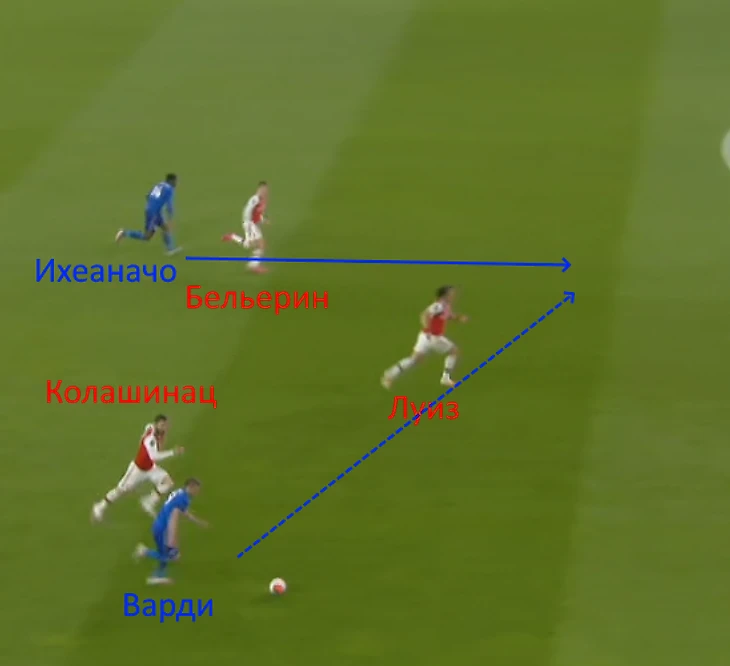 На 55-ой минуте пройдёт опаснейшая атака «Лестера». Варди прорвётся по правому флангу и выдаст передачу на Ихеаначо. Бельерин и Луиз не успеют прервать пас.