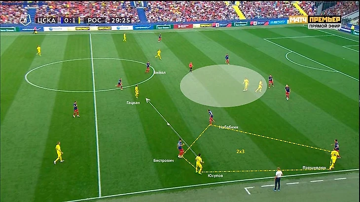При преодолении первой линии прессинга «Ростов» часто использовал сдвоенный фланг. Особенно часто это практиковали Юсупов и Паршивлюк. Дальше атака развивалась по ситуации. Первый сценарий: фуллбек «Ростова» и кто-то из пары Юсупов — Салетрос в зависимости от фланга атаки отвлекали на себя внимание сразу двух центральных полузащитников хозяев и направляли мяч в освободившуюся зону.