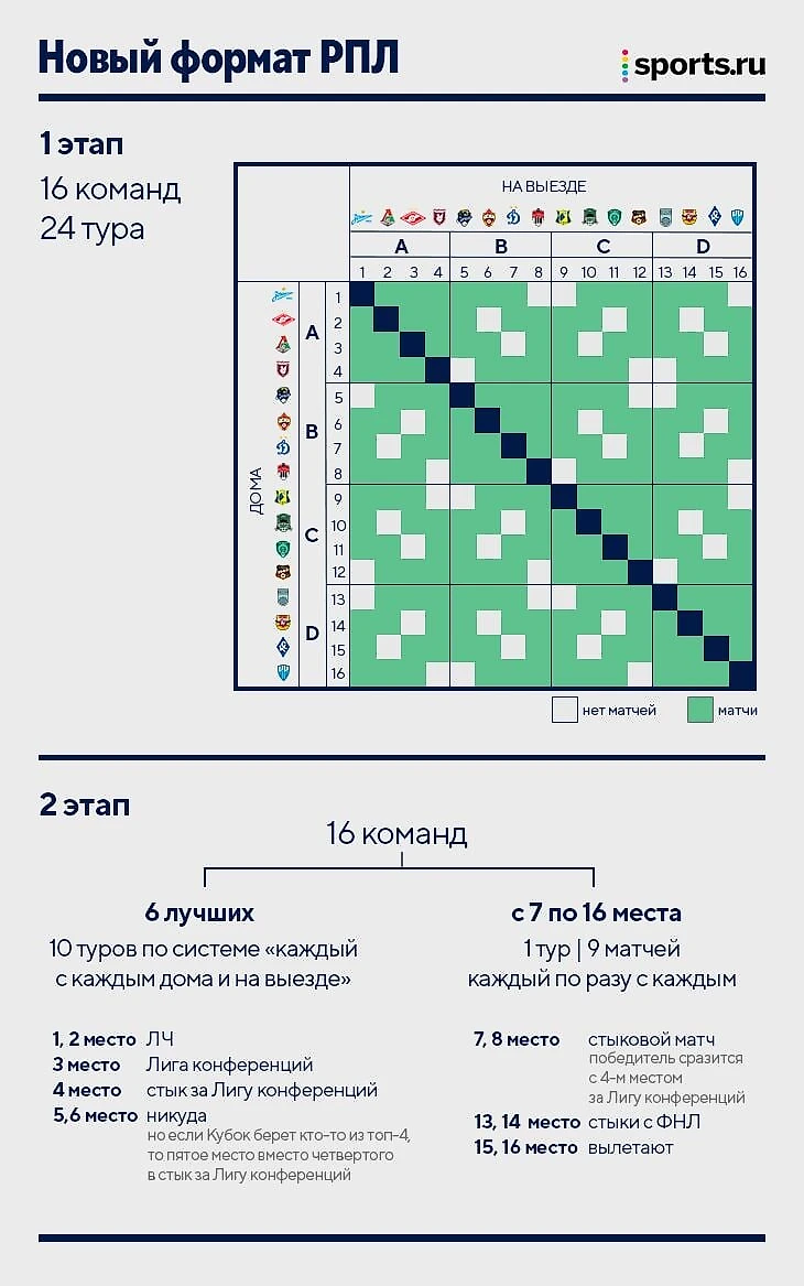РПЛ начиная с сезона-2022/23 должна проходить в два этапа. На первом все 16 команд играют в единой таблице, а после 24 туров делятся на две группы: топ-6 и с 7-го по 16-е места.