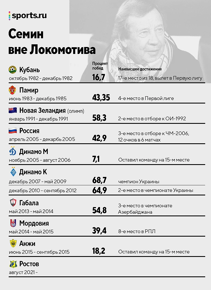 За почти 40-летнюю тренерскую карьеру Семин только 10 лет работал не в «Локо». Зато объездил половину стран СНГ и даже слетал в Новую Зеландию!