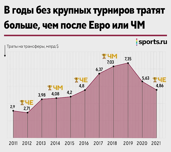 С суммами сделок похожая ситуация. Объем сделок в долларах растет каждый год вне зависимости от крупных турниров. А падения зависят только от экономических кризисов. Из-за кризиса в Европе на трансферы в 2012-м потратили меньше, чем в 2011-м. Второе заметное падение – с 2020-го из-за ковидного кризиса.