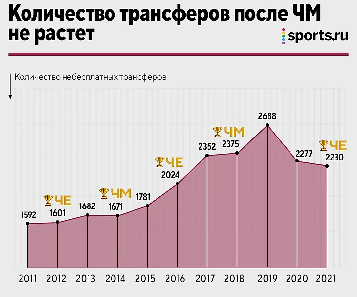 Количество трансферов постоянно растет, но чемпионаты мира и Европы стабильно выпадают.