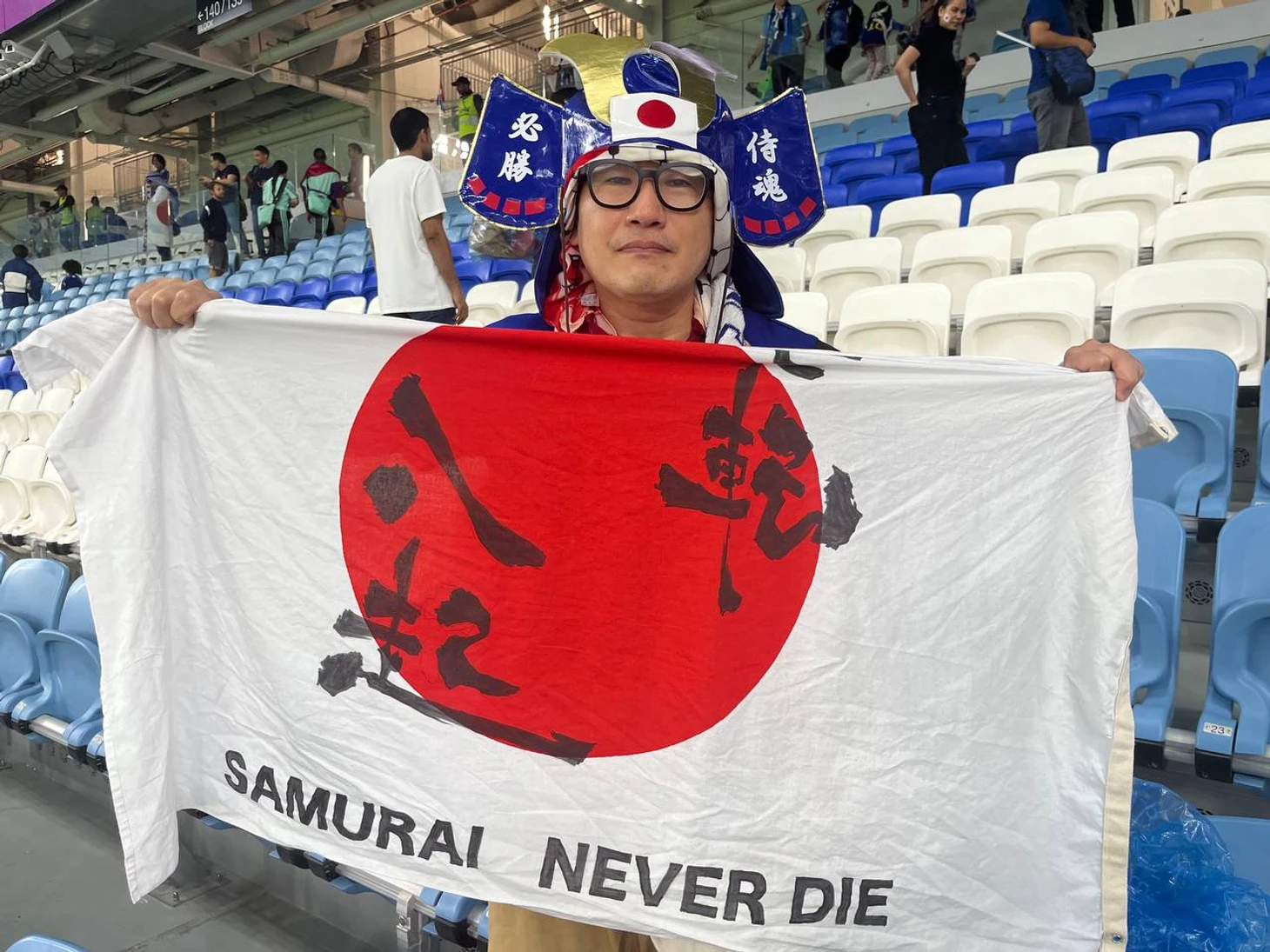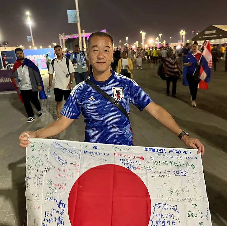 «Я работаю учителем в школе, – объясняет 55-летний Масаки. – На флаге больше 50 надписей. Это мои ученики написали послания в Катар. Тут пожелания, фамилии любимых игроков сборной Японии, имена учеников. Все детишки смотрят футбольные матчи чемпионата мира. Но уже завтра я полечу к ним, обратно в Токио.