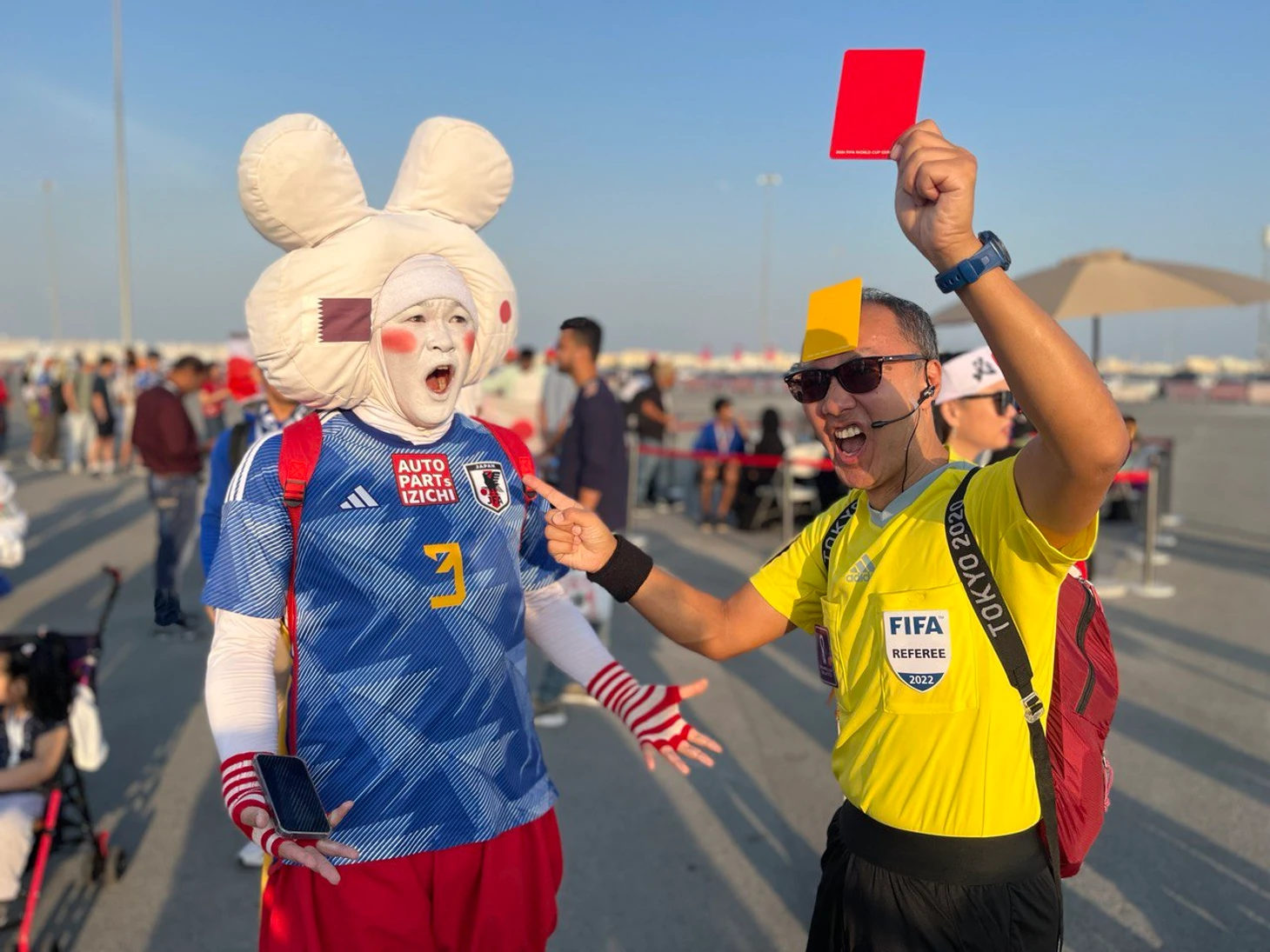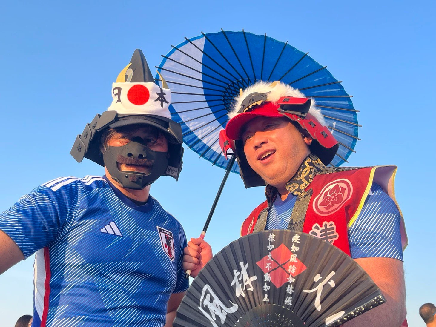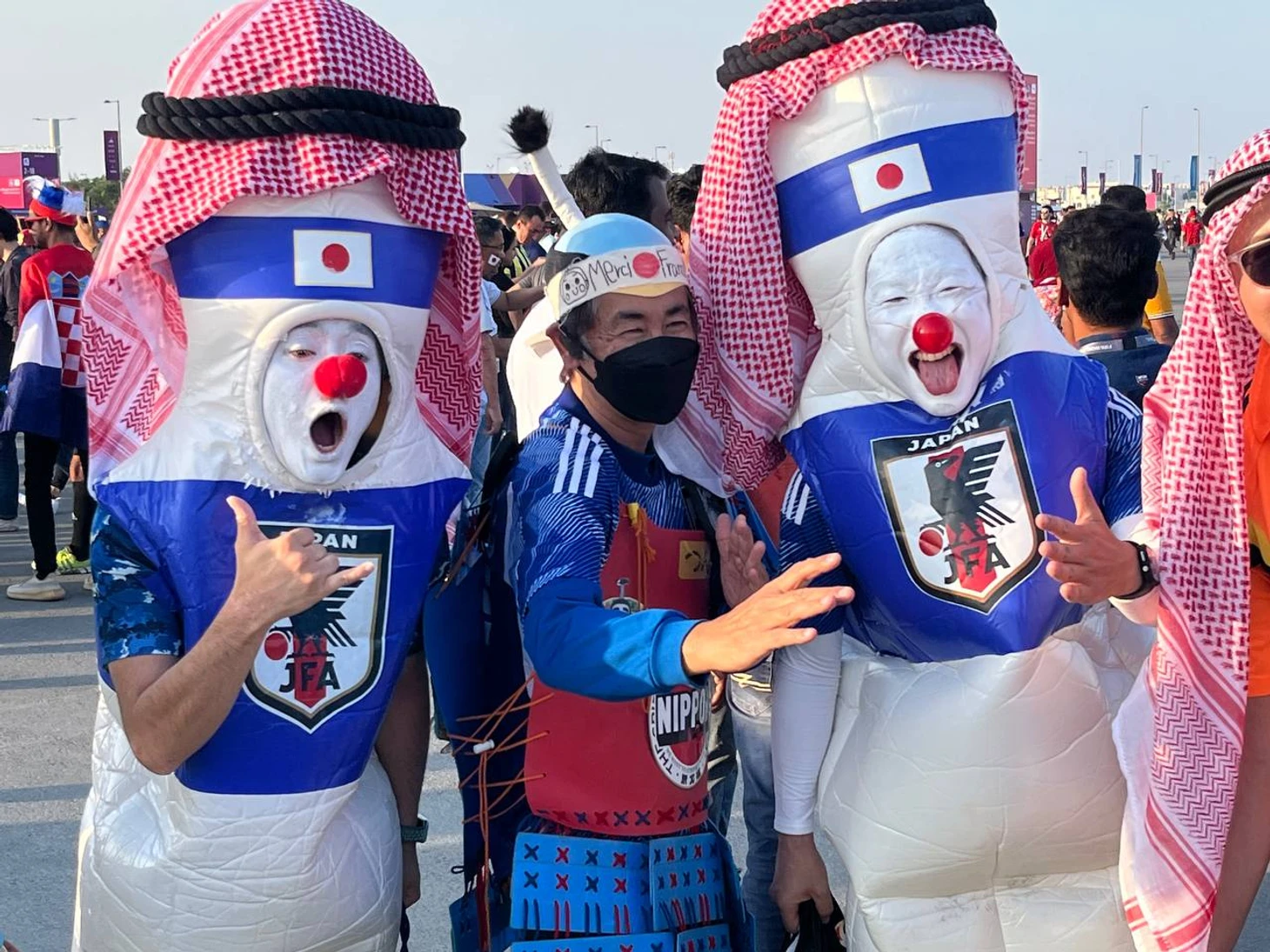 Японских болельщиков тоже очень много. У них своя тусовка вокруг стадиона: рядом проезжает мексиканец на электросамокате с колонкой, оттуда играет музыка из аниме. Японцы гуляют в костюмах самураев.