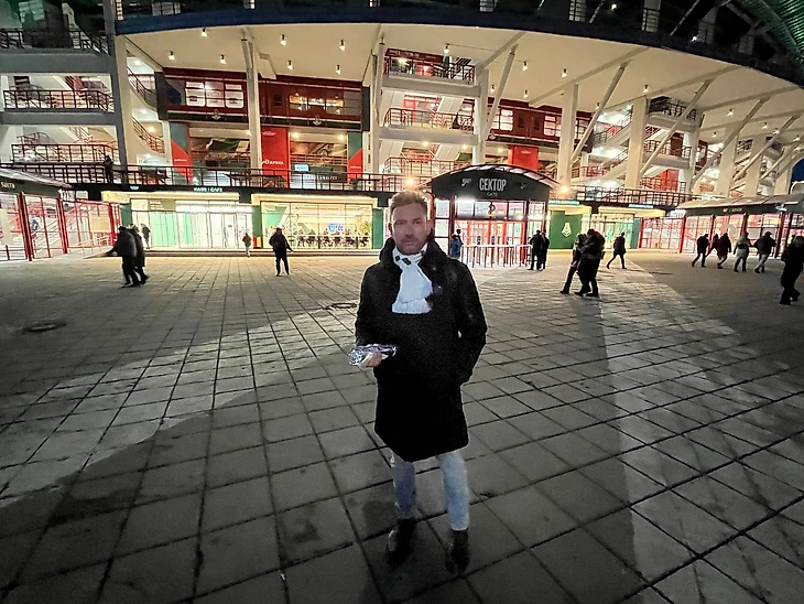 А вот снаружи – совсем грустно. Стадион красиво светится на закате, но люди совсем не идут.