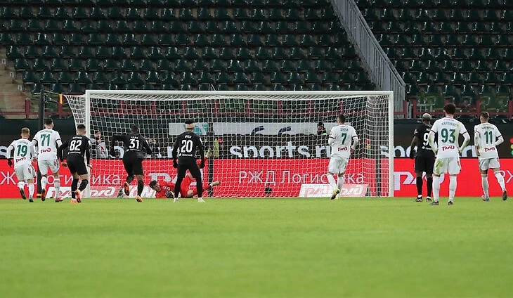 Через пять минут у «Локо» был еще оди шанс. Сергей Пиняев кружил на фланге вокруг Сергея Волкова (обыграл между ног), сбежал от Кади и прострелил на Дзюбу. Мяч прилетел к нему от руки Кайо. Тогда пенальти не назначили, но на 52-й минуте первого тайма (время сильно затянулось из-за нескольких просмотров ВАР) Сперцян наступил на ногу Смольникову.