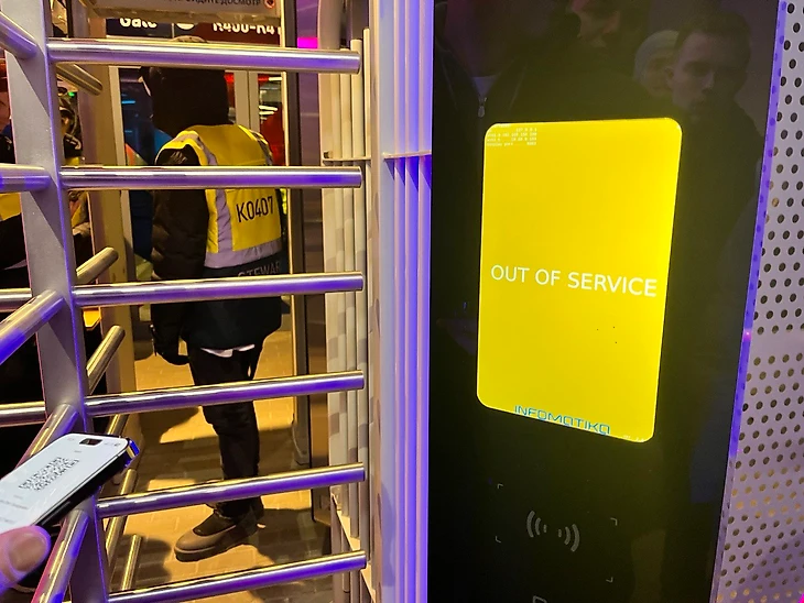Оказалось, система Fan ID зависла. На турникете – желтый фон и надпись: Out of service. Болельщикам с центральной трибуны повезло чуть больше – у них сдвоенный турникет, поэтому очередь хотя бы двигалась.