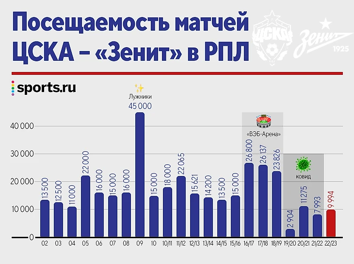 Всего на стадион зашли 9974 человека. Это новый лучший результат для Fan ID в Москве, но худший для матча ЦСКА – «Зенит» в новейшей истории без учета ковида. Хотя даже в ковидном сезоне-2020/21 на дерби в Москве пришли 11 тысяч. С 2002 года и на «Лужники», и на стадион «Динамо», и на «Арену Химки» приходило больше 10 тысяч.