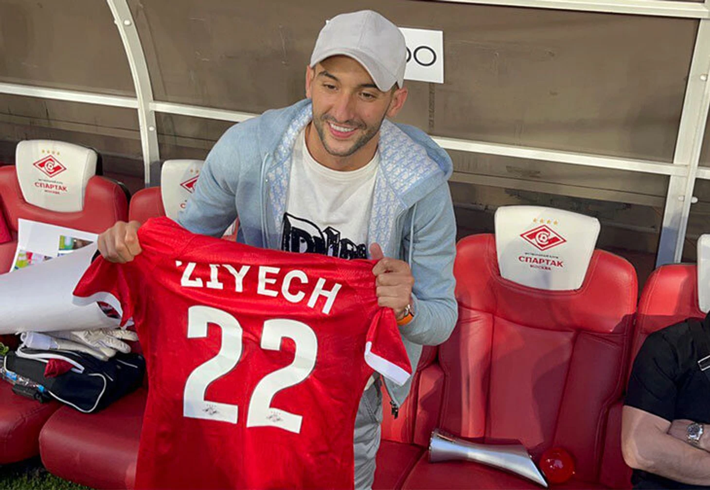 Хаким Зиеш из «Челси» примерил футболки «Спартака» и «Бей Беги». Он приехал в Москву тусоваться с Промесом