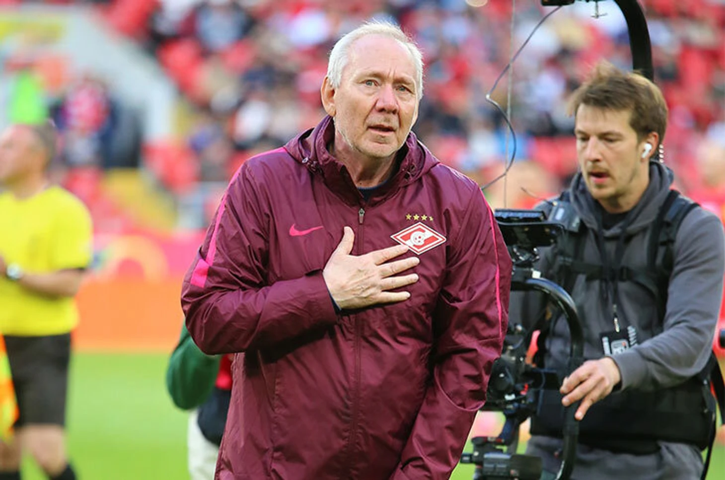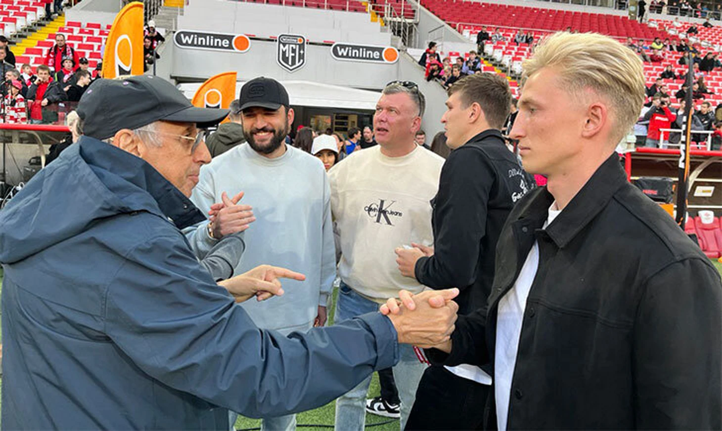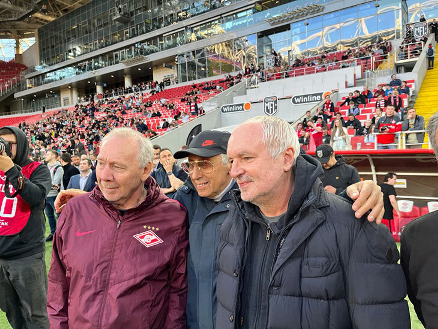 Там был Олег Романцев. Легендарный тренер надел бордовую куртку с эмблемой «Спартака», в которой ходят сотрудники клуба. Как будто это не 2023-й, а конец 90-х. Со стороны казалось, что Романцеву немного некомфортно: смотрел в пол, поправлял рукава. Ему предстояло нанести первый удар по мячу и поздороваться с болельщиками на трибуне B, которая уже давно пустует на матчах РПЛ.