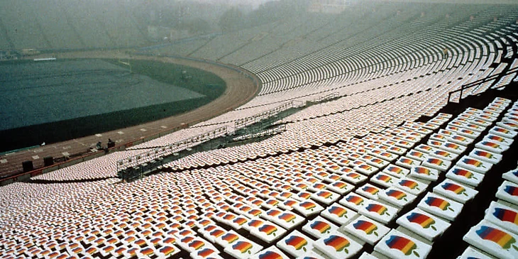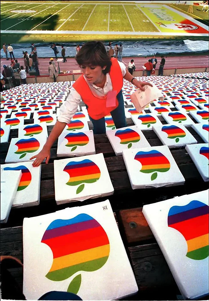 В 1985-м Apple снова ярко выступила в спорте: на все сиденья стадиона в Новом Орлеане перед началом Супербоула надели чехлы с изображением логотипа компании.
