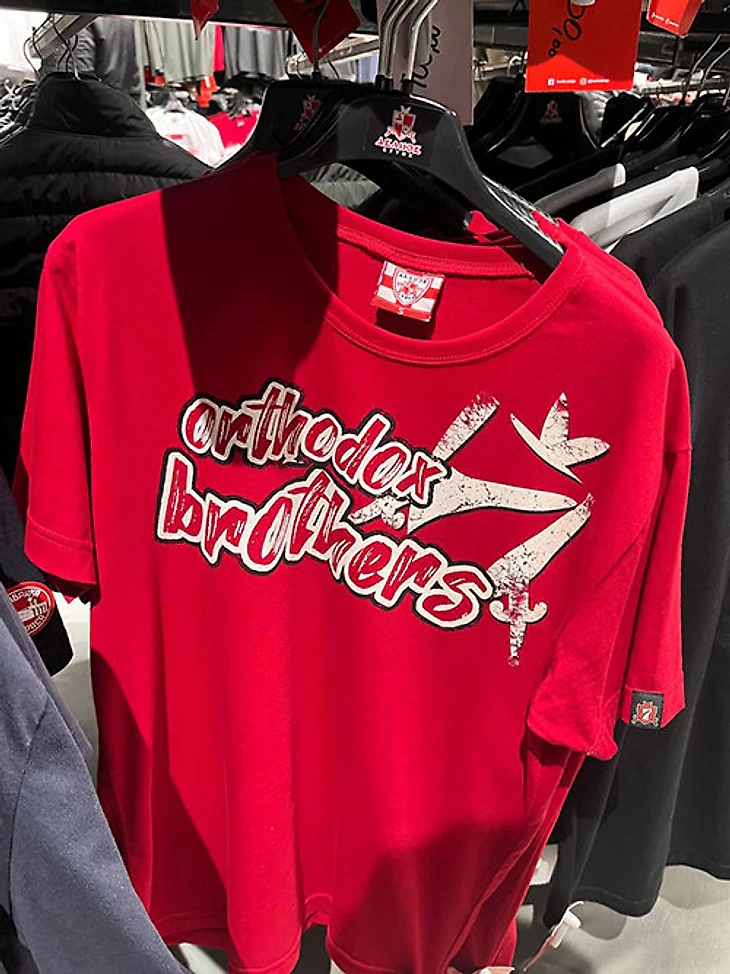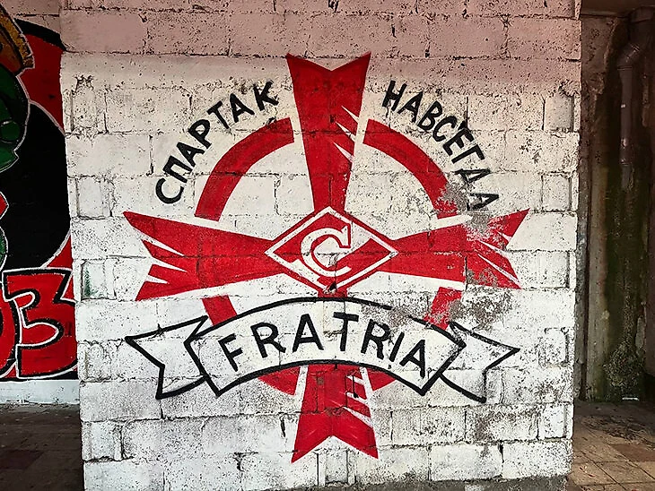 Еще в фаншопе продаются футболки orthodox brothers, на фанатской трибуне граффити «Фратрии», а на стадион приходят болельщики «Спартака».