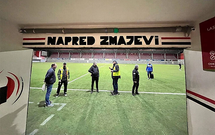 Коллеги воспользовались доступностью – и попросили поснимать игру прямо с бровки (во время матча чемпионата Сербии без разрешений и документов!). Кажется, в России на такой запрос просто покрутили бы пальцем у виска. Но сербский сотрудник позвонил старшим по рации и стал уточнять. После нескольких минут переговоров он все-таки запретил: но только потому что делегату матча такое не понравится. Зато пообещал, что выйти на поле после матча – вообще не проблема.