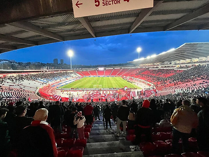 На трибунах «Райко Митича» действительно жарко. На игру с «Чукаричками», четвертой командой лиги, пришли всего 14 тысяч человек (на 55-тысячной арене это смотрелось немного грустно). Но огни и активная поддержка компенсировали пустые места.