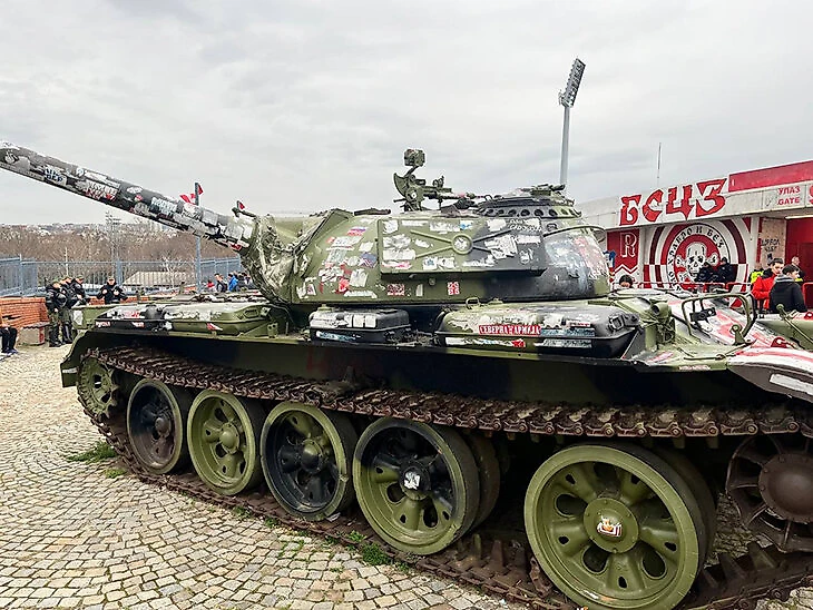 Напротив арены стоит советский танк Т-55 конца 50-х-начала 60-х, обклеенный опознавательными знаками фанатов «Звезды».