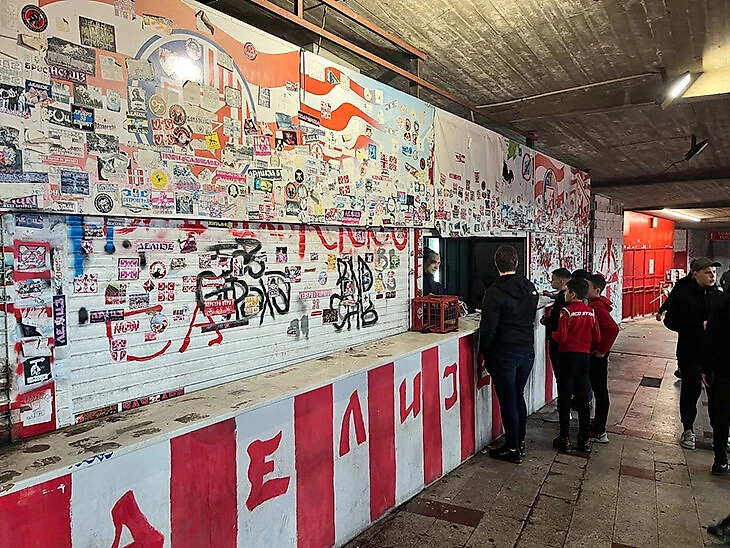 Буфет с напитками (их продают сразу в пластиковых стаканах) увешан наклейками, вся трибуна – в граффити. В перерыве фанаты ходят с синими мусорными пакетами и собирают деньги на операцию соратнику, который получил травму, упав с высоты.