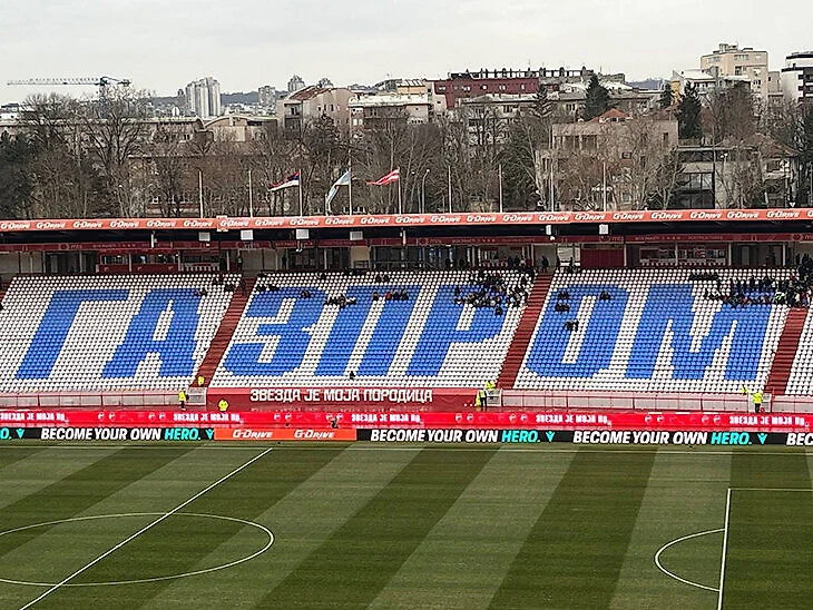 Вообще, у «Звезды» очень много связи с Россией. Например, спонсор – «Газпром» (уже 14 лет). И он тут везде. На футболках – латиницей, на трибунах – кириллицей, на табло и рекламных щитах – G-Drive и G-Energy. Кстати, на обратной стороне этих щитов – флаги Сербии и России с надписью «Заjeдно» (вместе) и лого «Газпрома».