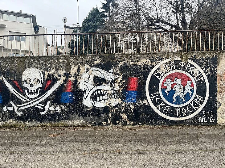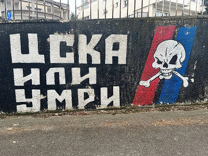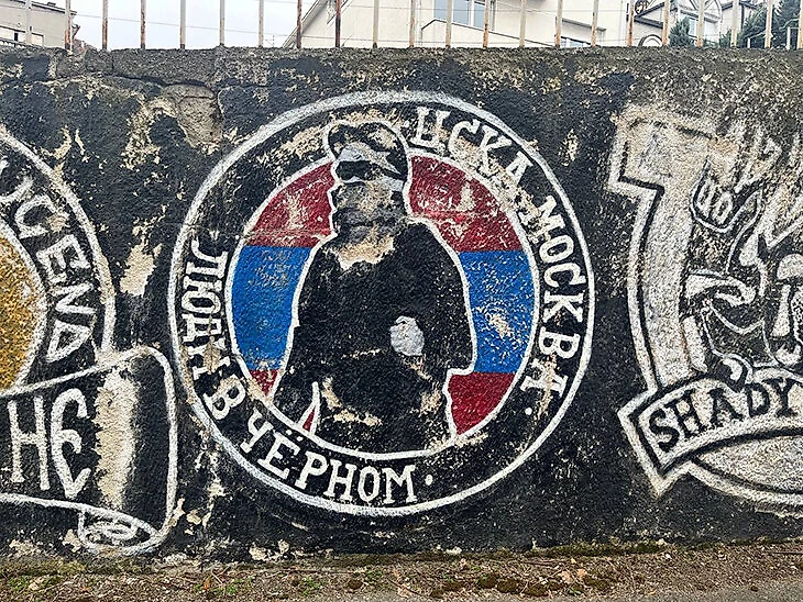 Болельщики «Партизана» – «гробари» или могильщики. Так что вся арена внушает страх. Все в черепах, граффити в память об убитых болельщиках черно-белой команды. Даже стена ЦСКА (да, у «Партизана» целая стена граффити в поддержку братского клуба из России) выглядит специально устрашающе:
