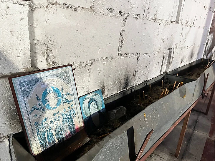 А еще на трибуне можно поставить свечку за упокой. Тут православные иконы и надпись: «Тем, кто отдал жизнь в отечественных войнах 91-99 годов, и всем жившим ради наших побед»