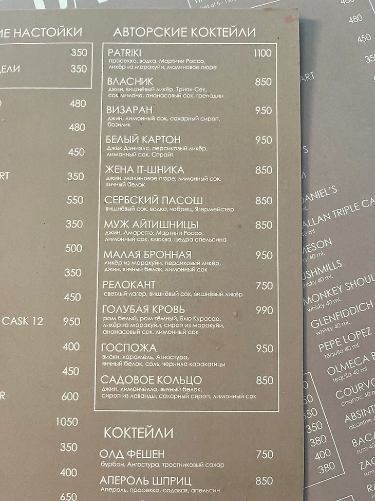 Так что атмосфера в субботу – как внутри Садового кольца. Здесь даже есть свои Патрики: гуляя по центру, я наткнулся на такую кафешку в старом городе. Тут все специально для айтишников, которые заскучали по родине: внутри говорят только по-русски, играют в мафию, едят оливье, бефстроганов и борщ с коктейлями: «Малая Бронная», «Релокант», «Визаран», «Муж айтишницы» и «Жена айтишника».