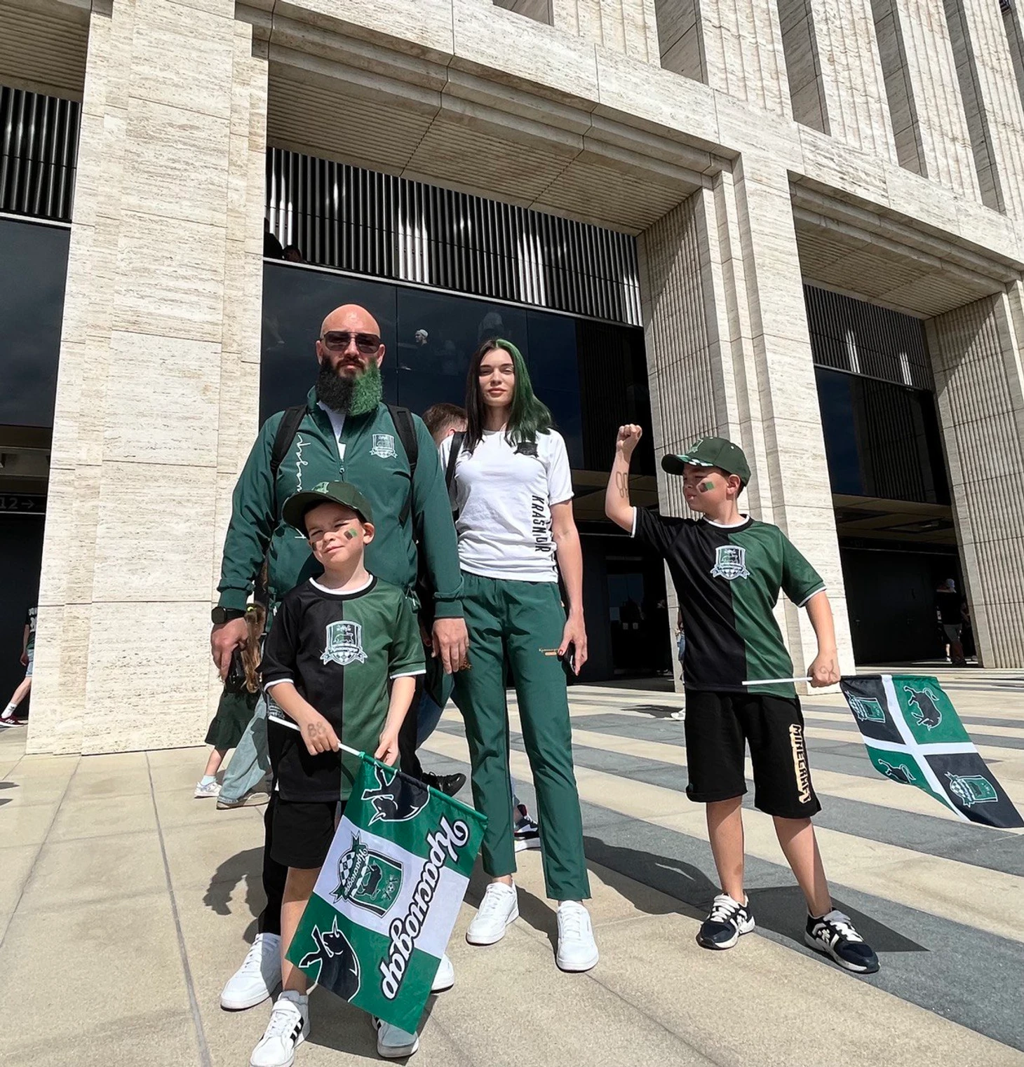 Георгий и Мария подготовились к матчу – и покрасились. Георгий – бороду, Мария – голову. Правую половину – в черный, левую – в зеленый.
