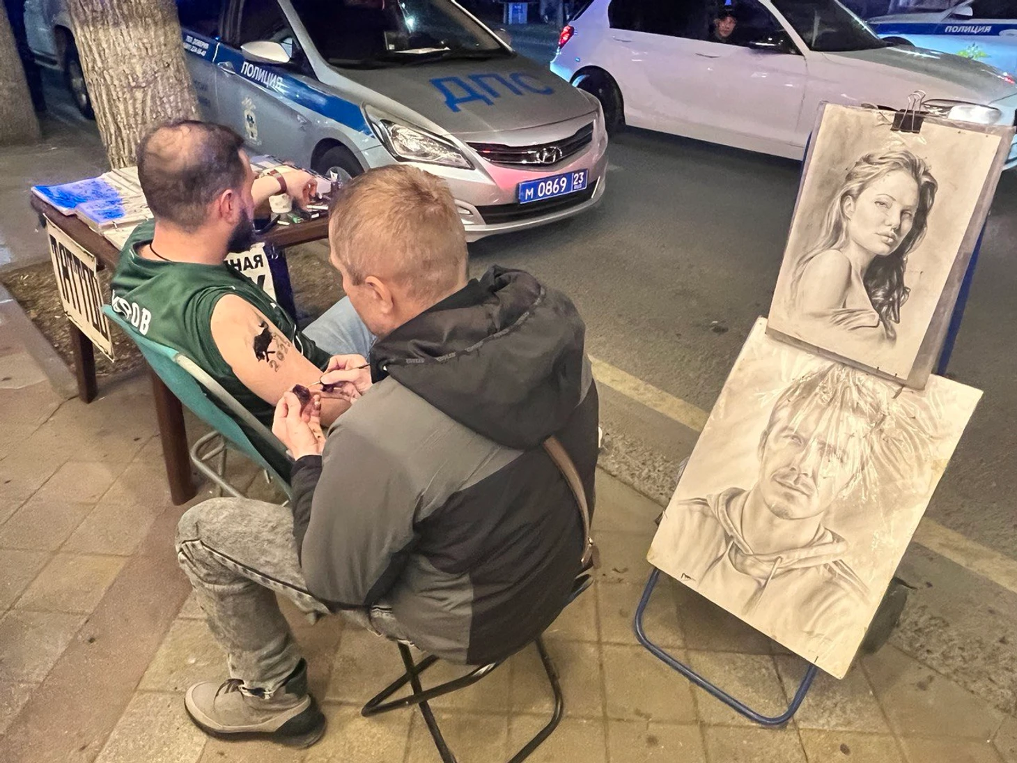 Мастер тату среди этого праздника набивает на плече мужчины быка.