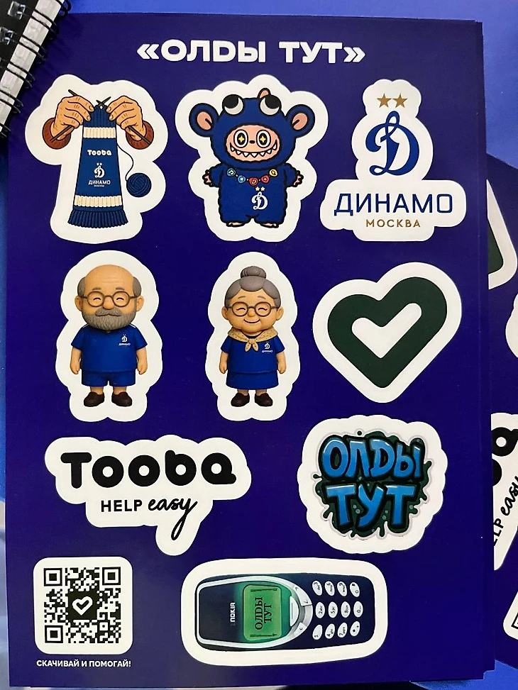 Чтобы поучаствовать в розыгрыше нужно было просто сделать пожертвование на 350 рублей в благотворительный фонд – и получить стикерпак «Олды тут» с лабубу, вязаным шарфом, старым телефоном Siemens и бабушкой и дедушкой в форме «Динамо». Такие игрушки для взрослых.
