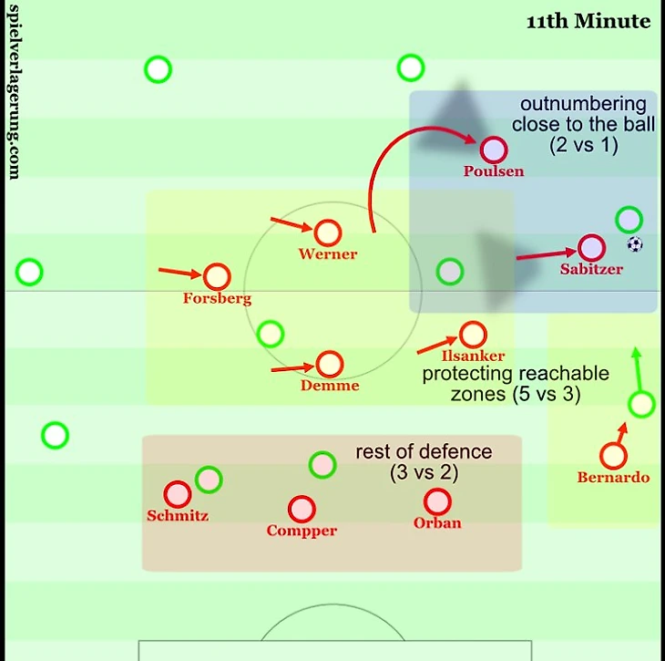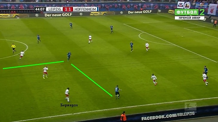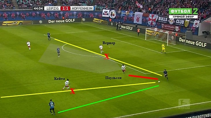 На левого центрального защитника «Хоффе» ориентирован Поульсен, Кейта за счет cover-shadowперекрывает направление паса в полуфланг, Вернер перекрывает линию паса поперек, но Цубер остается неприкрытым – при этом позиция швейцарца достаточно глубокая, чтобы на него выдвинулся фулбек «Лейпцига.