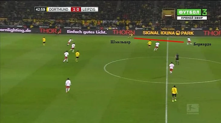 Бартра в спешке вынужден пасовать на Шмельцера – тот в более высокой позиции, и Бернардо уже может выдвинуться с меньшим риском получить атаку за спину – мяч в конечном счете будет перехвачен.
