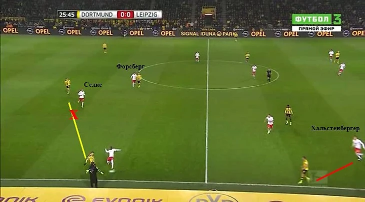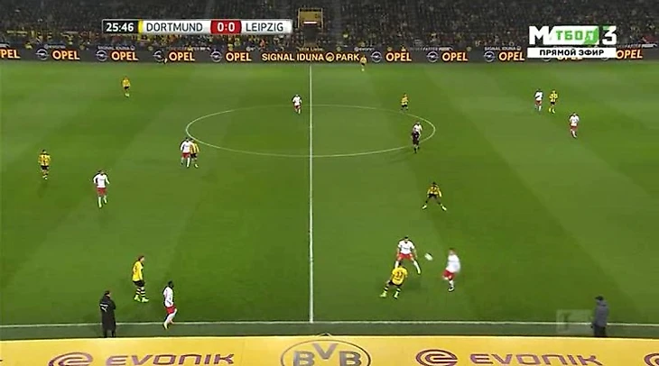 Дортмунд провел 6 контратак, 5 из них были явными голевыми моментами – это не следствие плохой работы «Лейпцига» в позиционном блоке. Позиционная структура гостей при атаке была плоха (большие расстояния между игроками), следовательно был плох контрпрессинг, именно поэтому Дортмунд хорошо убегал в контру. Однако с точки зрения сдерживания хозяев в постепенном продвижении мяча «Лейпциг» был хорош. За это Хазенхюттля необходимо похвалить (не стоит забывать, что он обходился без 4 игроков основы).