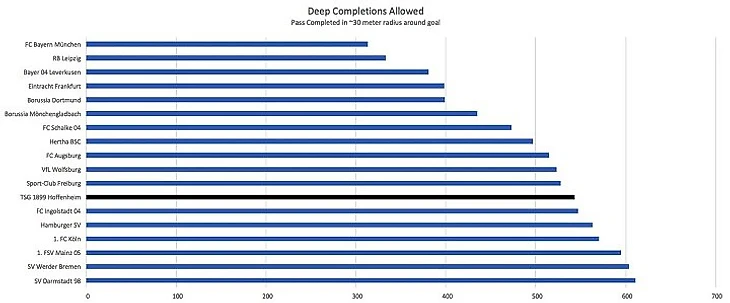 Долгое время у «Лейпцига» была лучшая оборона лиги (исходя из качества моментов, которые имели соперники). Сейчас, после приличного числа допущенной опасности с «Баварией», Дортмундом и «Гамбургом», они где-то третьи (после Мюнхена и «Айнтрахта») – хотя у нас еще нет данных по последнему туру. Еще один показатель силы обороны «Лейпцига» отражается в числе передач, которые они допустили в радиусе 30 метров от ворот (deep completions allowed в метрике Дастина Уорда) – на момент двухнедельной давности, собственно до матчей с «Хоффе» и «Боруссией».