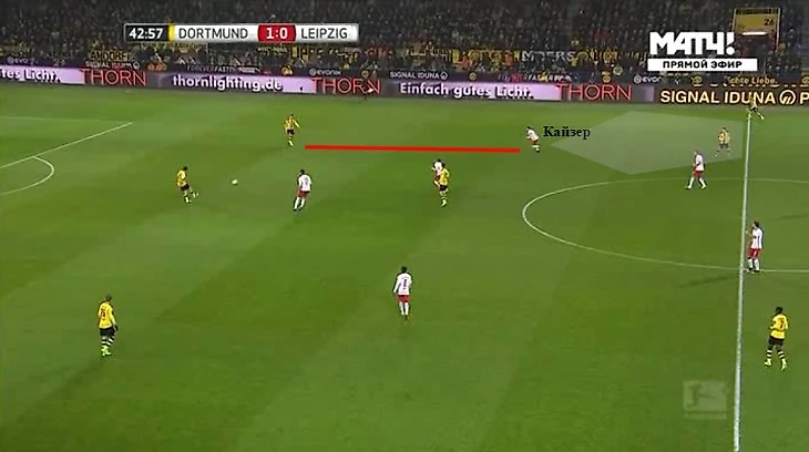Похожий пример – на Бартра выдвигается Кайзер, играющий инсайда, а Геррейро под тенью.