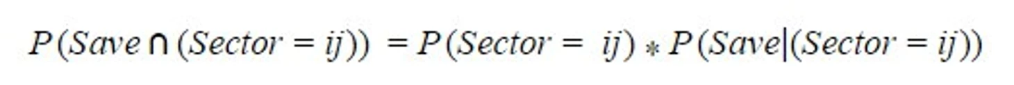 Согласно формуле условной вероятности, шанс отбить удар в конкретном секторе равен произведению вероятности того, что удар пойдет в конкретный участок и того, что мяч будет отбит, при условии, что он пришелся именно в рассматриваемый сектор. Просуммировав найденные вероятности сейва по всем секторам, получим итоговый шанс отбить удар при выбранной модели поведения.