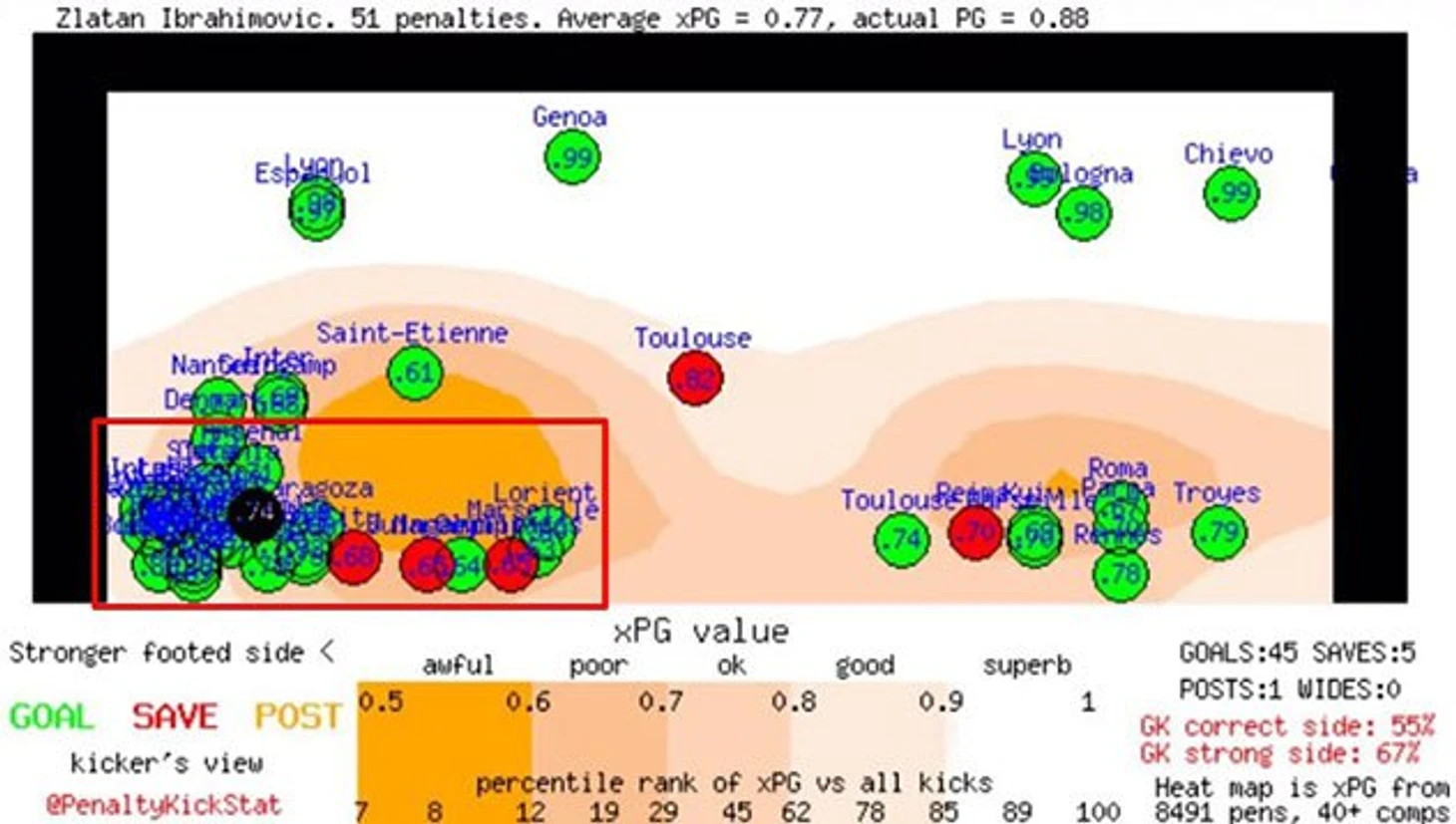 Несмотря на высокий процент реализации, только 20 ударов Ибрагимовича из 51 направлялись не в левый нижний угол, отмеченный прямоугольником. Впрочем, осторожным прыжком вправо отбить мяч, пущенный Иброй под штангу, сложно - нырок должен быть резким, далеким, а также не слишком ранним.