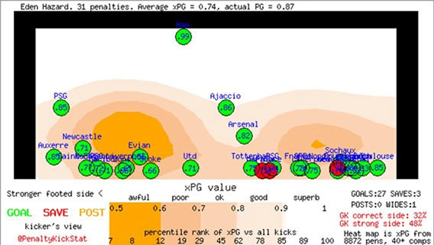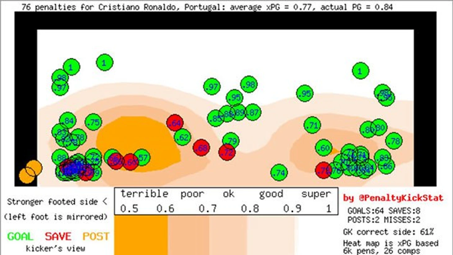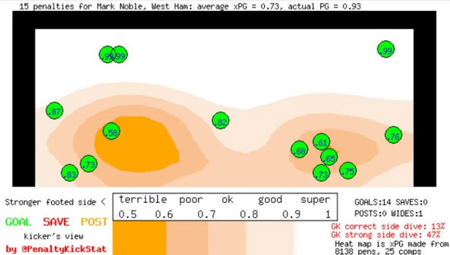 В тексте будут использоваться карты, публикуемые в твиттере @PenaltyKickStat. Эти изображения построены на выборке, на данный момент включающей в себя свыше 9 000 пенальти, пробитых в топ-лигах начиная с 2009 года.