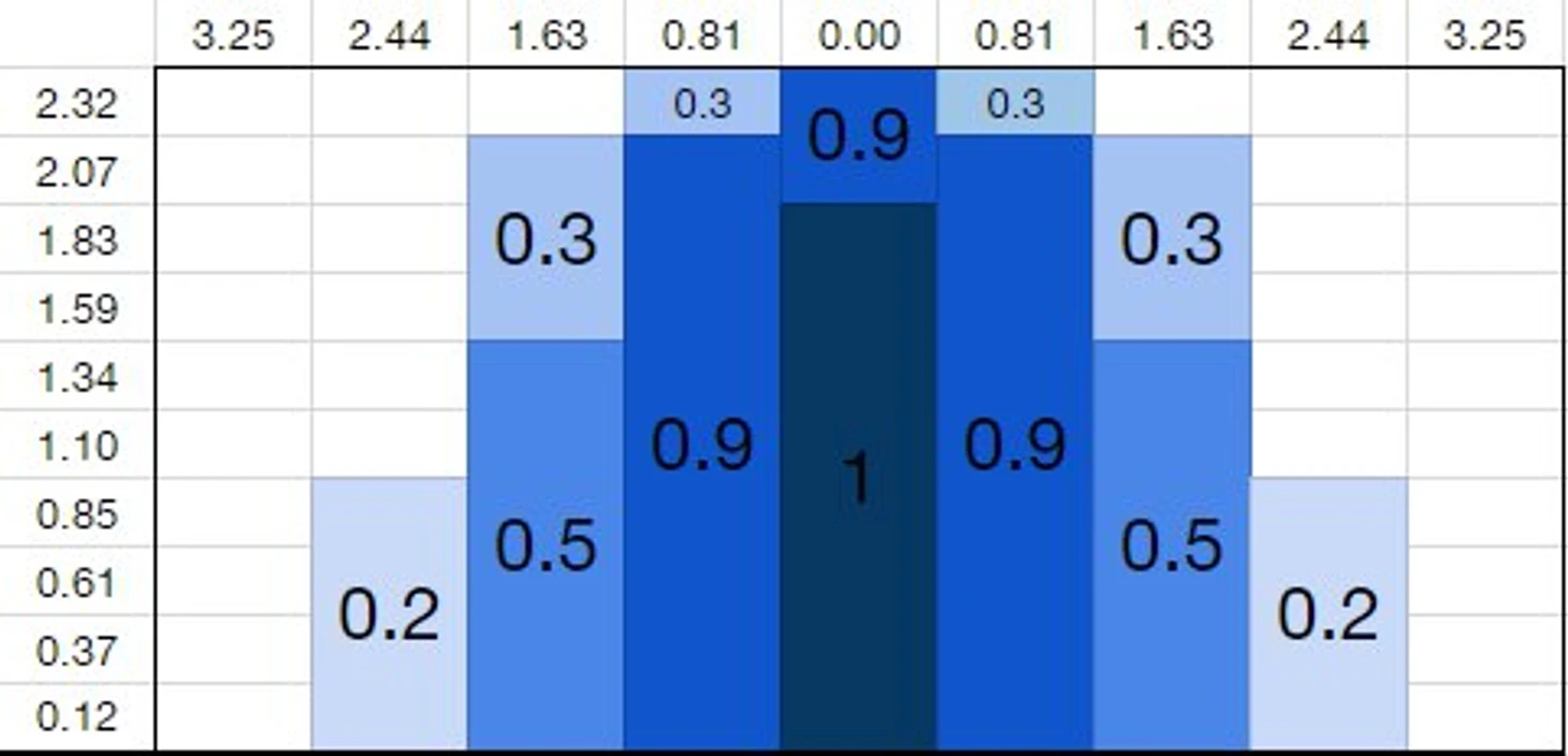 Футбольные ворота, поделенные на 9 частей по ширине и на 10 по высоте. Числа - вероятность сейва при условии, что мяч послан в конкретный сектор. Данные @penaltykickstat.