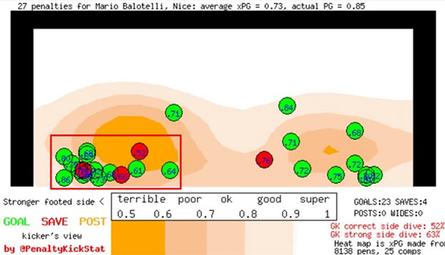 Марио Балотелли - в красном прямоугольнике 16 ударов из 27; процент correct side dive зауряден.