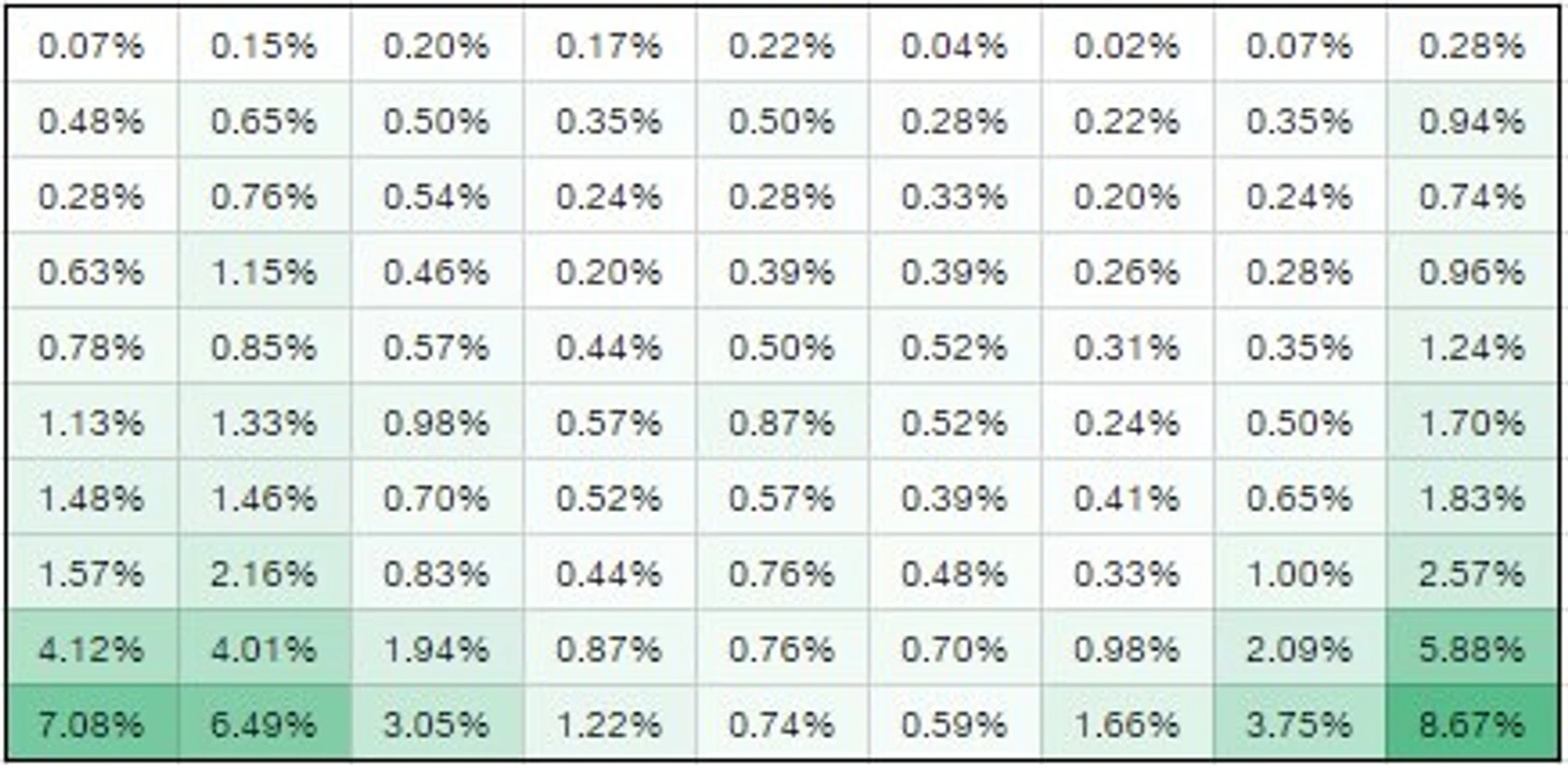 Карта, показывающая, в каких секторах чаще всего отражаются удары. Значения найдены умножением (и нормированием на получение в сумме 100%) чисел из предыдущих двух таблиц по формуле условной вероятности.