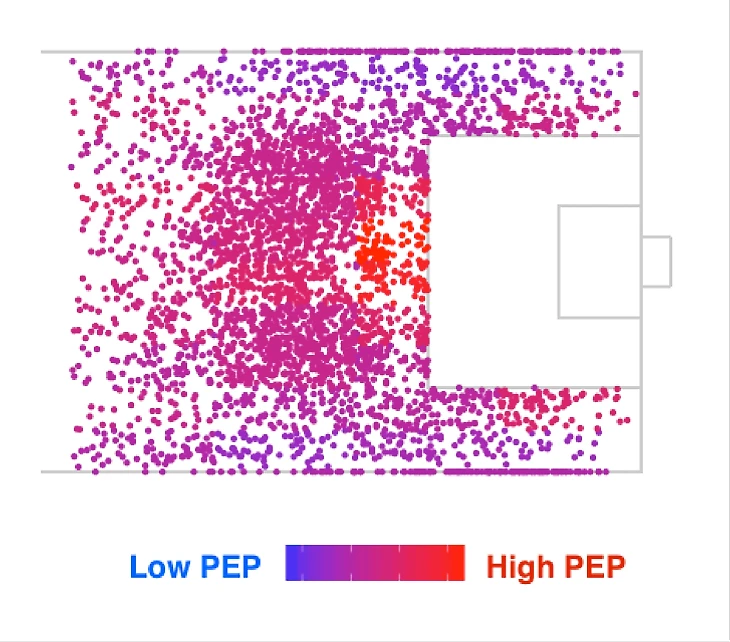 Также есть небольшое исследование Сэма Грегори на эту тему, который назвал свой новый показатель, рассчитывающий опасность пасов, PEP (Pass ExpG Projections). Система работает так: Сэм рассматривает все передачи в Danger Zone, затем рассчитывает вероятность нанесения удара в следующие пять секунд после приема мяча в зависимости от локации, откуда следовал пас. Так вот РЕР = xG удара * Р(удара в ближайшие пять секунд относительно точки на поле, откуда отдали передачу).