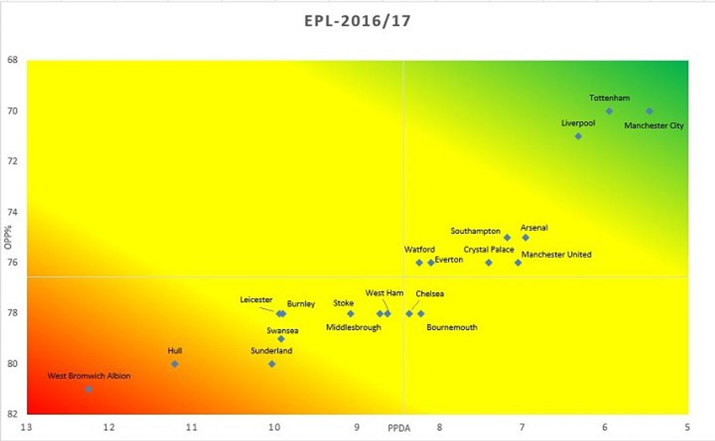 В чем фундаментальное отличие от того же «ВБА», который тоже не особо занимался прессингом и недалеко ушел по PPDA (12,25) и точности передач соперника (81%)? Пулис понимает, что беспрепятственно допускать соперника в радиус 30 метров от своих ворот – это значит серьезно облегчать ему жизнь. В сезоне-2016/17 «ВБА» встречал соперника выше, чем «Халл» при Фелане, и средняя линия оборонительных действий была примерно на 2,5 координаты выше. Вдобавок, если сравнивать «Халл» и «ВБА» на отрезке работы Фелана, то «Вест Бром» ограничивал соперников на самой низкой доле передач между зонами 6 и 5 (в терминологии Дастина Уорда) во всей лиге, то есть либо контролировал их в зоне 6 без продвижения, либо разворачивал назад, либо форсировал лонгболл – и то, и другое, и третье за счастье для «ВБА» (учитывая средний рост их задней линии). «Халл» же примерно в два раза чаще «Вест Брома» позволял соперникам низом проходить в соседнюю более верхнюю зону.