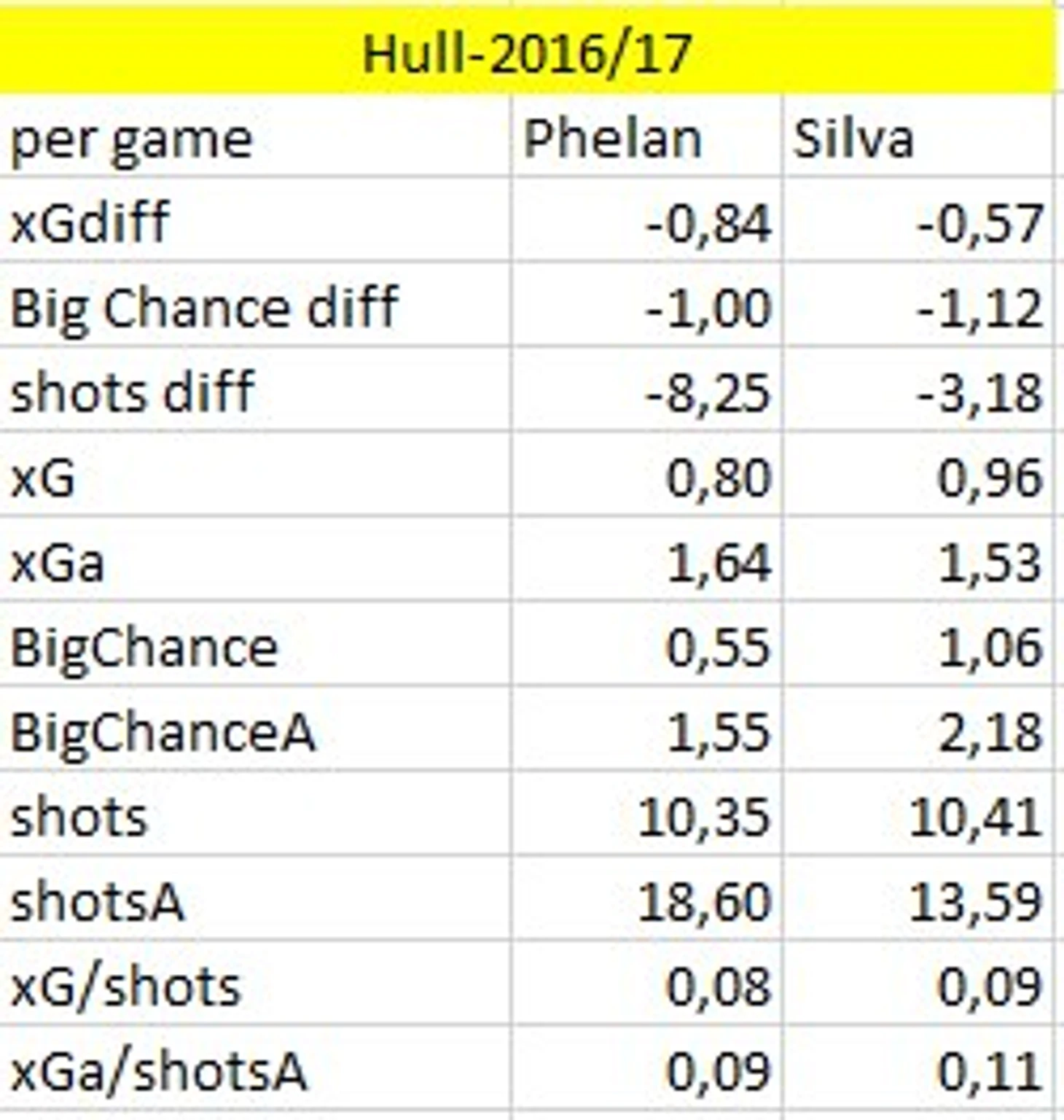 На отрезке при Фелане у «Халла» была худшая атака (0,8 xG/game), худшая оборона (1,64 xG/game) и худшая разница в среднем за матч (-0,84 xG/game, у вылетевшего «Сандерленда» разница (-0,75)) – при таком продолжении они бы с отрывом заняли последнее место по итогам 38 туров. Даже «Сандерленд» в среднем за игру допустил меньше ударов (17,8), чем «Халл» на отрезке Фелана – 18,6. Конечно, в последних играх Майка наметилось определенное улучшение: допускали меньше ударов и повыше встречали соперника, но это была динамика от «очень плохо» до «плохо».