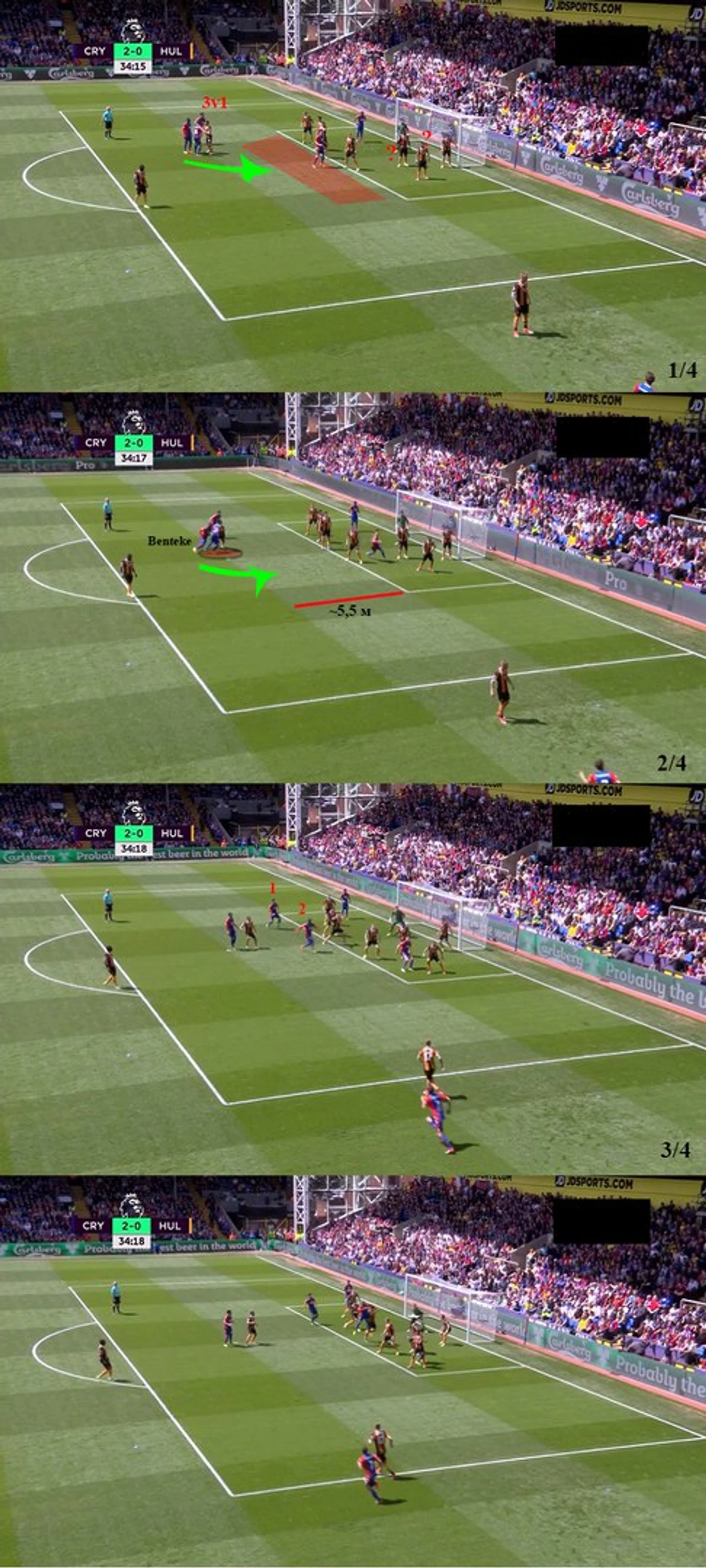 Через неделю игра с «Пэласом» в гостях, позарез надо выигрывать. Угол. И что? Опять нет второй линии. «Пэлас» имеет 3v1 у набегающих игроков – Миливоевич ставит легкий заслон для Бентеке, который разбегается, имеет 5,5 метра гандикапа – и забивает.