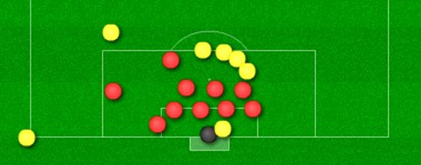 Фундаментальная проблема зоны при Силве на стандартах – отсутствие второй линии и неэффективное расположение игроков во вратарской. Зонная система предполагает наличие ~4 человек вдоль линии вратарской и еще либо 3 человек в дополнительной линии перед ними (чтобы затруднить атакующей группе разбег), либо что оставшиеся разбирают 3-4 набегающих соперника, еще один стоит на углу вратарской, один – на подборе, один – на линии штрафной. Понятно, что хороших вариантов много, но идеальная зона в моем понимании – это примерно так: две линии 4-3, один на линии штрафной на случай короткого розыгрыша, один на линии вратарской на случай забегов на ближнюю штангу, один контролирует возможный пас на полукруг штрафной и отскок: