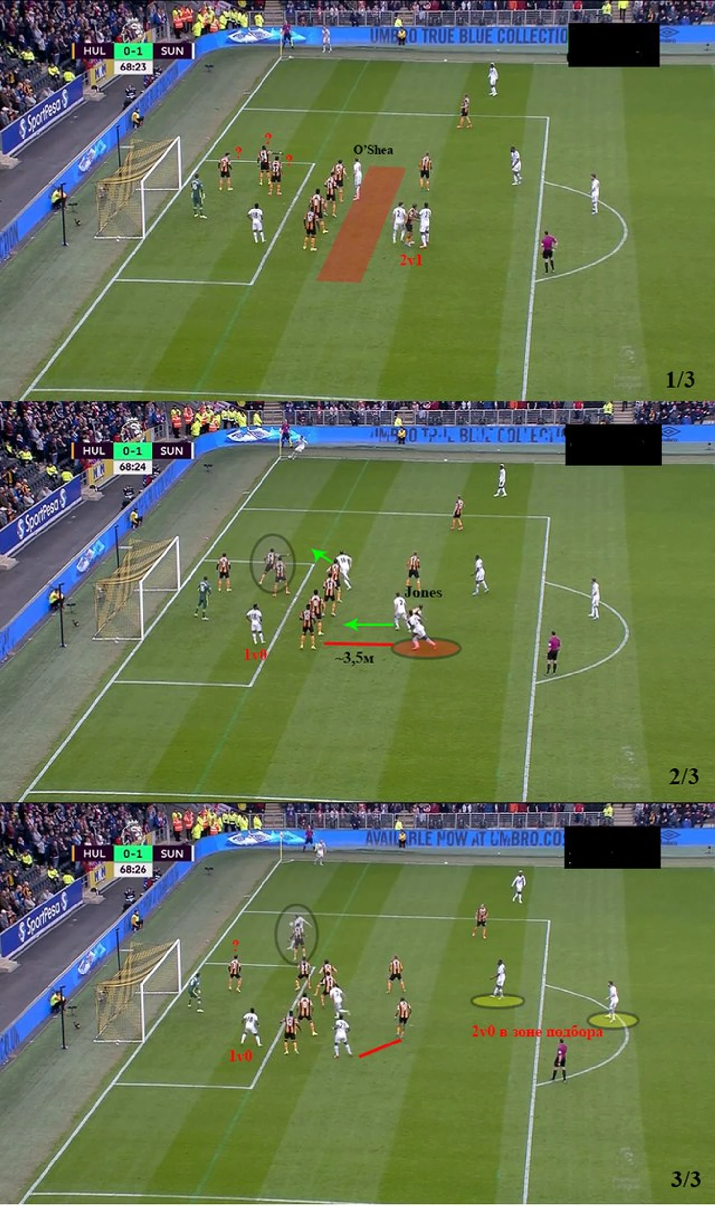О’Ши скидывает – Джонс, не встретив загородительную линию, на темпе влетает на линию вратарской и замыкает. Раноккия (упустивший якобы рывок Джонса, хотя однозначно сказать нельзя – у Джонса перевес по темпу) тут виноват в гораздо меньшей степени, чем неработающая система. Причем забавно, что «Сандерленд» контролирует все подборы – Дефо один во вратарской (готов реагировать на сэйв), на линии штрафной тоже 2v0. В итоге «Халл», имея 10 (+ вратарь) против 5 в штрафной, пропускает со стандартного положения. Дичь.